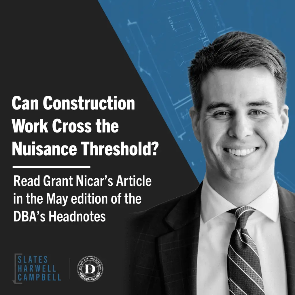 Slates Harwell Campbell is proud to announce that our associate attorney Grant Nicar’s article “Can Construction Work Cross the Nuisance Threshold?” was published in the May 2025 iteration of the Dallas Bar Association’s Headnotes publication